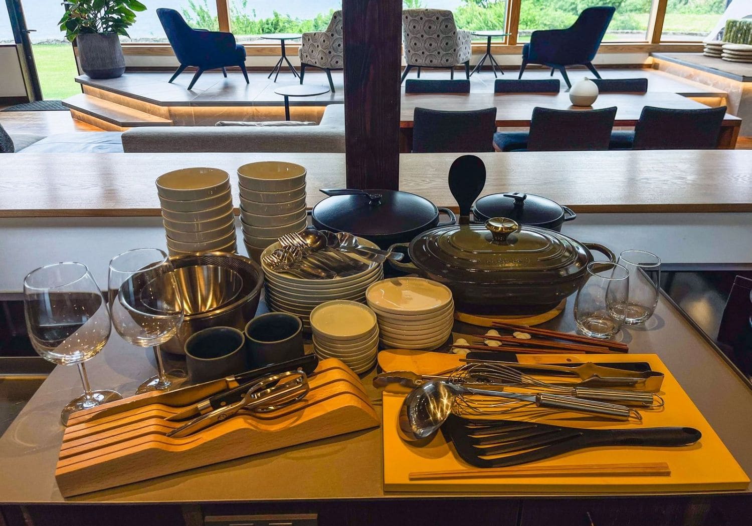 広々としたカウンターキッチンには、冷蔵庫や電子レンジ、炊飯器などの家電が完備されており、調理道具や食器類も充実しています。大人数での食事や本格的な調理にも対応できる設備が整っています。